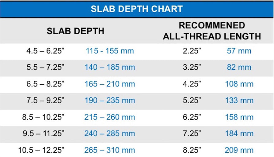 The FinStand accepts a 1/2” x 13 threaded rod. Using a threaded rods provides up to 1- 3/4” of vertical adjustment. Nylon threaded rod can easily be cut to size on the job site. For slab with thickness >8” we recommend using a steel threaded rod. The following list the required length of rod for the corresponding slab depth. (INSERT: slab depth chart A+)